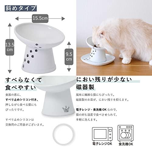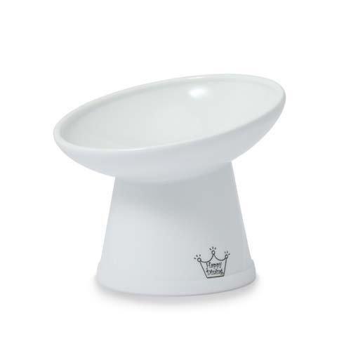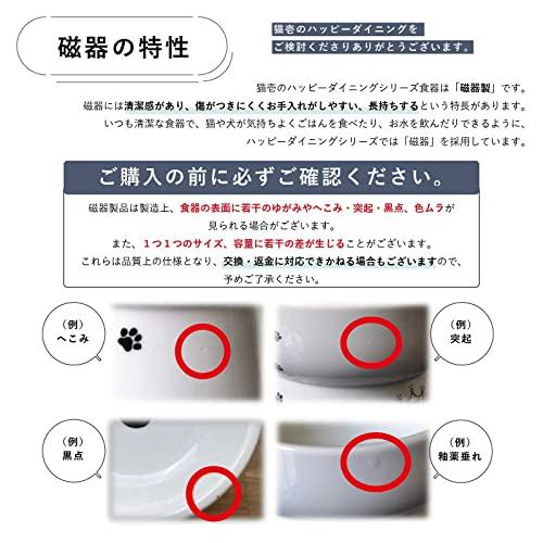 ハッピーダイニング 脚付フードボウル「斜めタイプ」は器手前の高さ9.5cm、器奥が13.5cm。器直径は15.5cm、深さは4cm。猫壱のハッピーダイニング脚付食器の中では最大サイズです。そして手前を低く奥を高くすることで、さらに食べやすいフードボウルとなっております。